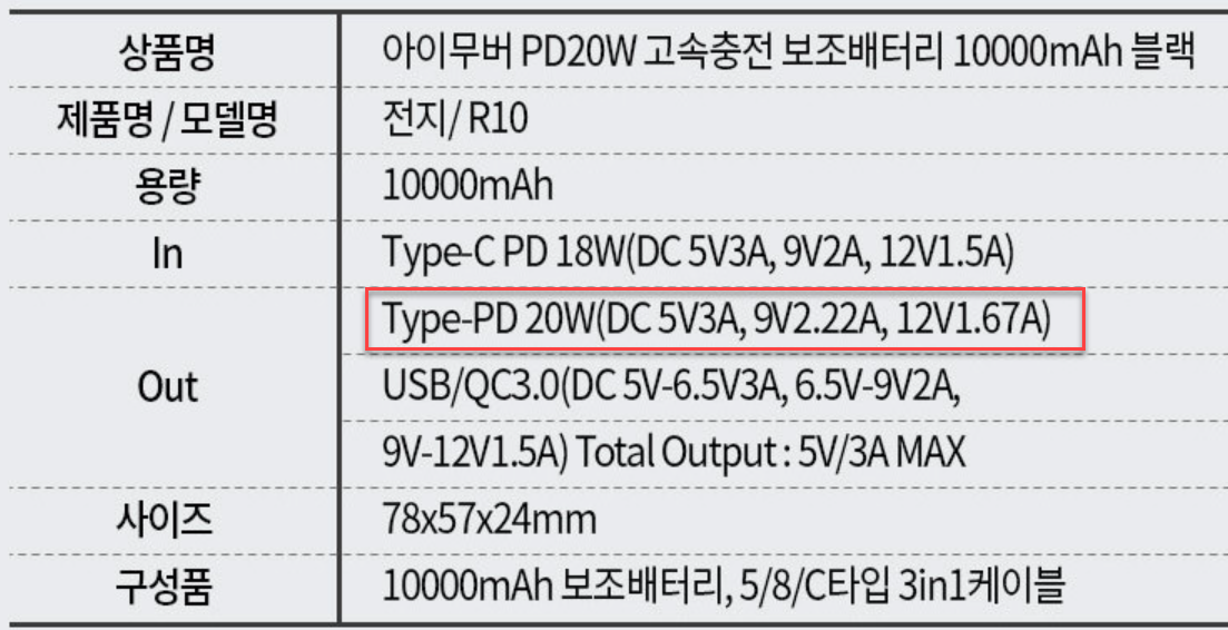 - 아이무버 미니 초소형 20000 보조배터리 PD 고속충전 20W, 294g, 62x87x30mm <– 30W 제품 단종으로 포기